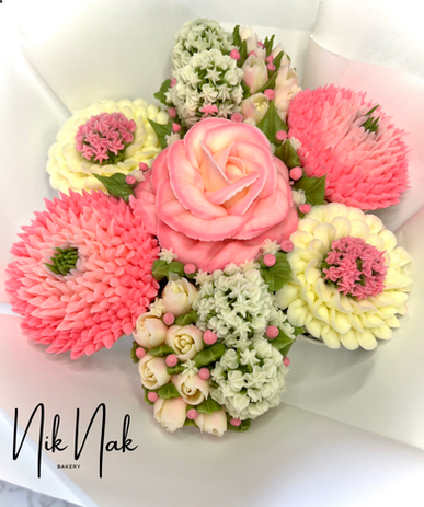 Florals that you can eat! These fresh flowers bloom year-round. They are homegrown by being hand mixed and measured then freshly baked and decorated until they reach full bloom. The bouquets are crafted with scratch-made bakery-style cupcakes and topped with Nak Nak Bakery's signature sweet, thick hand-piped buttercream. Each cupcake is edible art and its own masterpiece!